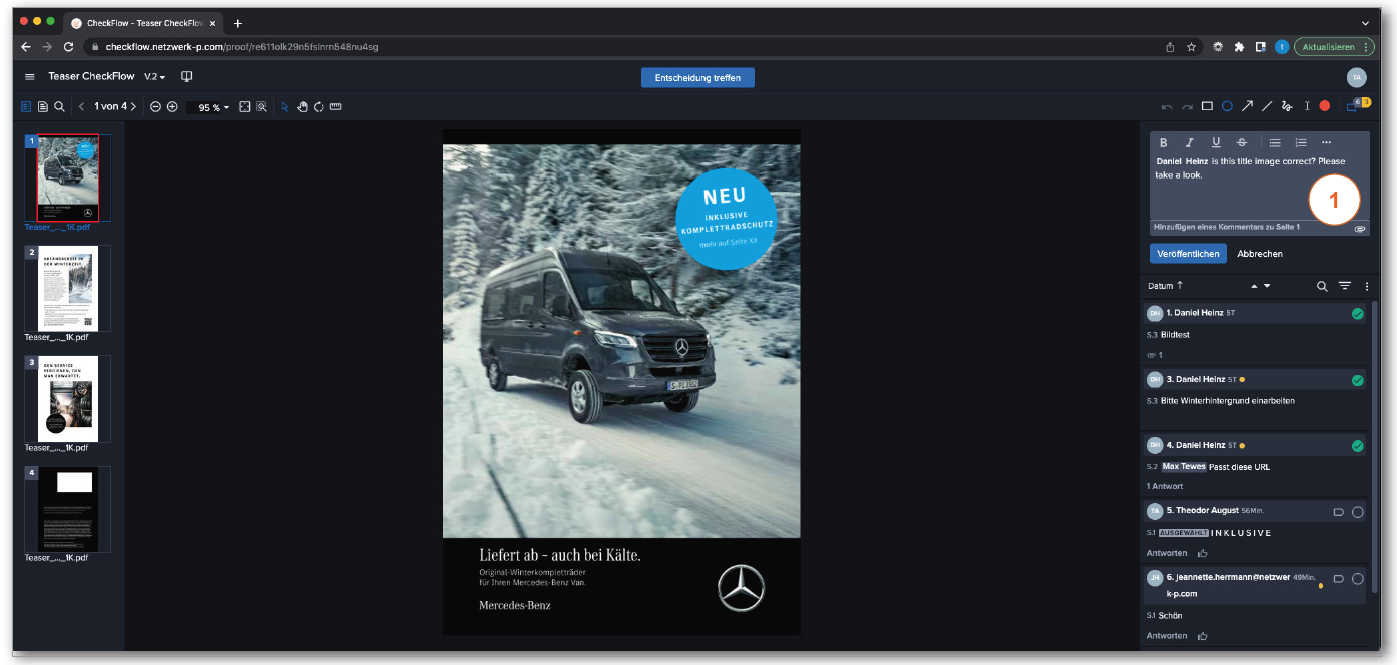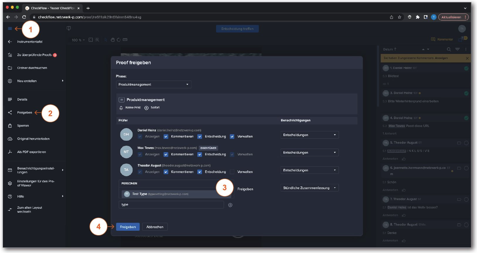 Seitenleiste mit Funktionen wie z. B. Übersicht aller aktiven Proofs, Proof-Details, Teilen-Funktion, Kommentar-Export und den Einstellungen